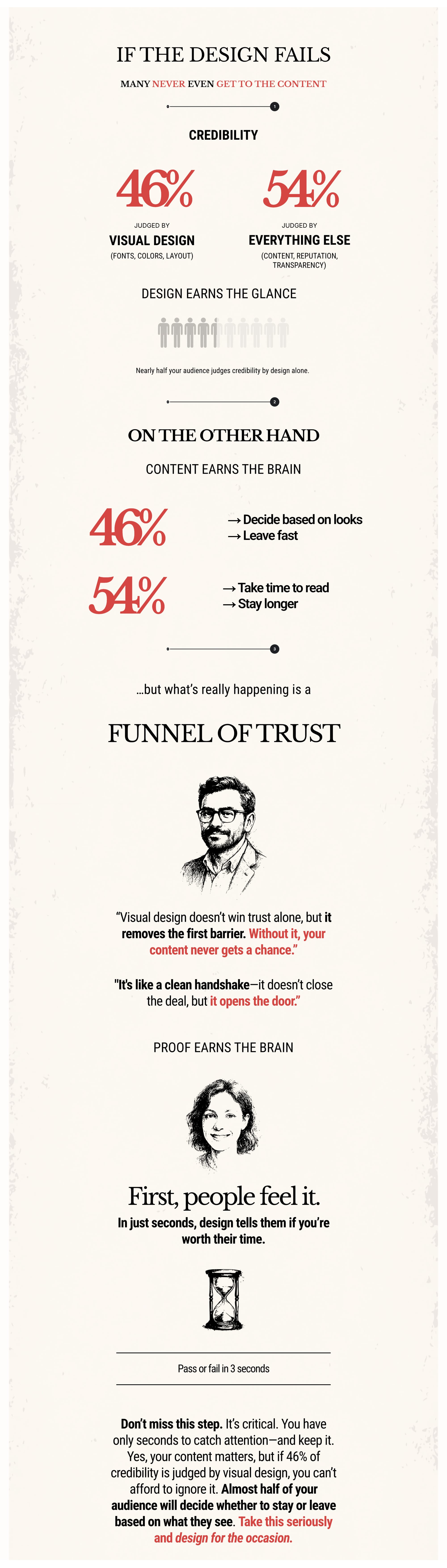 Nearly half of your audience decides whether to trust you in the first few seconds—based solely on design. Visual design earns the glance; content earns the brain. Miss that first impression, and your message may never even be read.